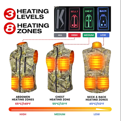 Sigurnost: Mirle Grijana lovačka jakna sadrži 1 10000 mah 5V bateriju koji se može u potpunosti napuniti u . jaknu, FCC, FCC, FCC, FCC, FCC, FCC, FCC-u prelazi 65 stepeni, automatski se nastavlja da se temperatura padne, i zatvara se u potpunosti ako se u potpunosti isključuje Doseže 75 stepeni . Pored toga, za siguran lov je dostupan plamen narančasti prsluk za siguran lov .